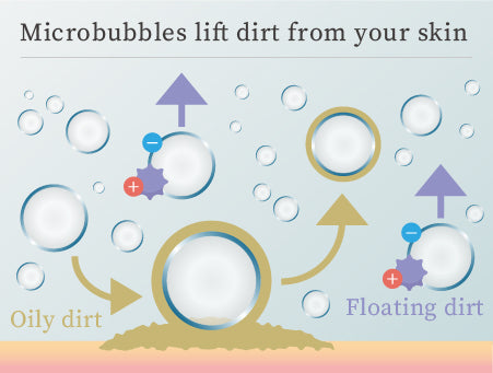 Microbubbles are negatively charged, which enables them to attract positively charged dirt, makeup foundation, and other skin contaminants embedded in your skin and lodged in your pores. Once microbubbles attach to dirt, grime, and oil, together, they float to the outer layers of your skin, where they can be easily washed away.