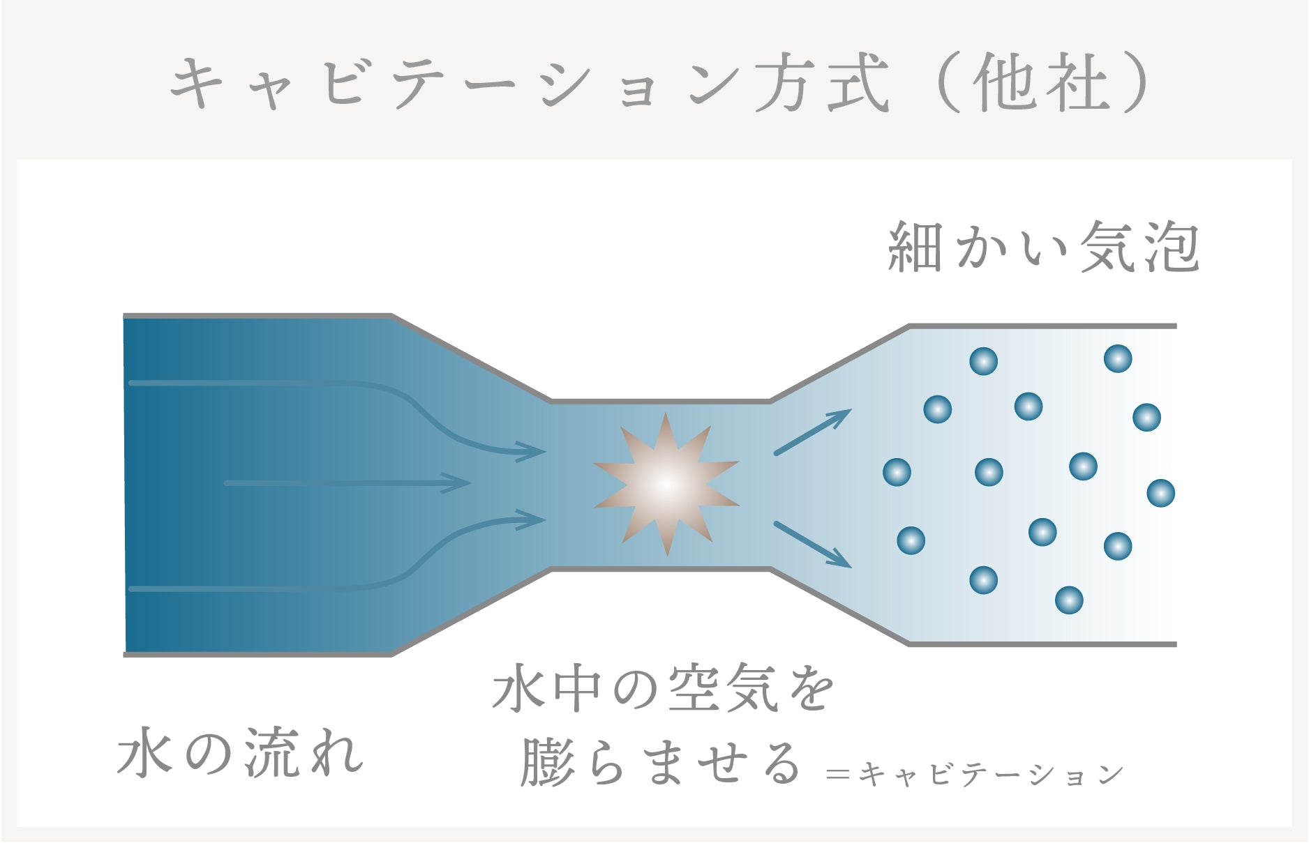 他社で用いられるもう一つのマイクロバブル発生方法であるキャビテーション方式は、水中に含まれる空気を膨らませることで気泡をつくります。例えば、夏は水中の空気量が少なくなるなど、その時の状況によってはマイクロバブルを発生できなくなる場合があり安定的とは言えません。