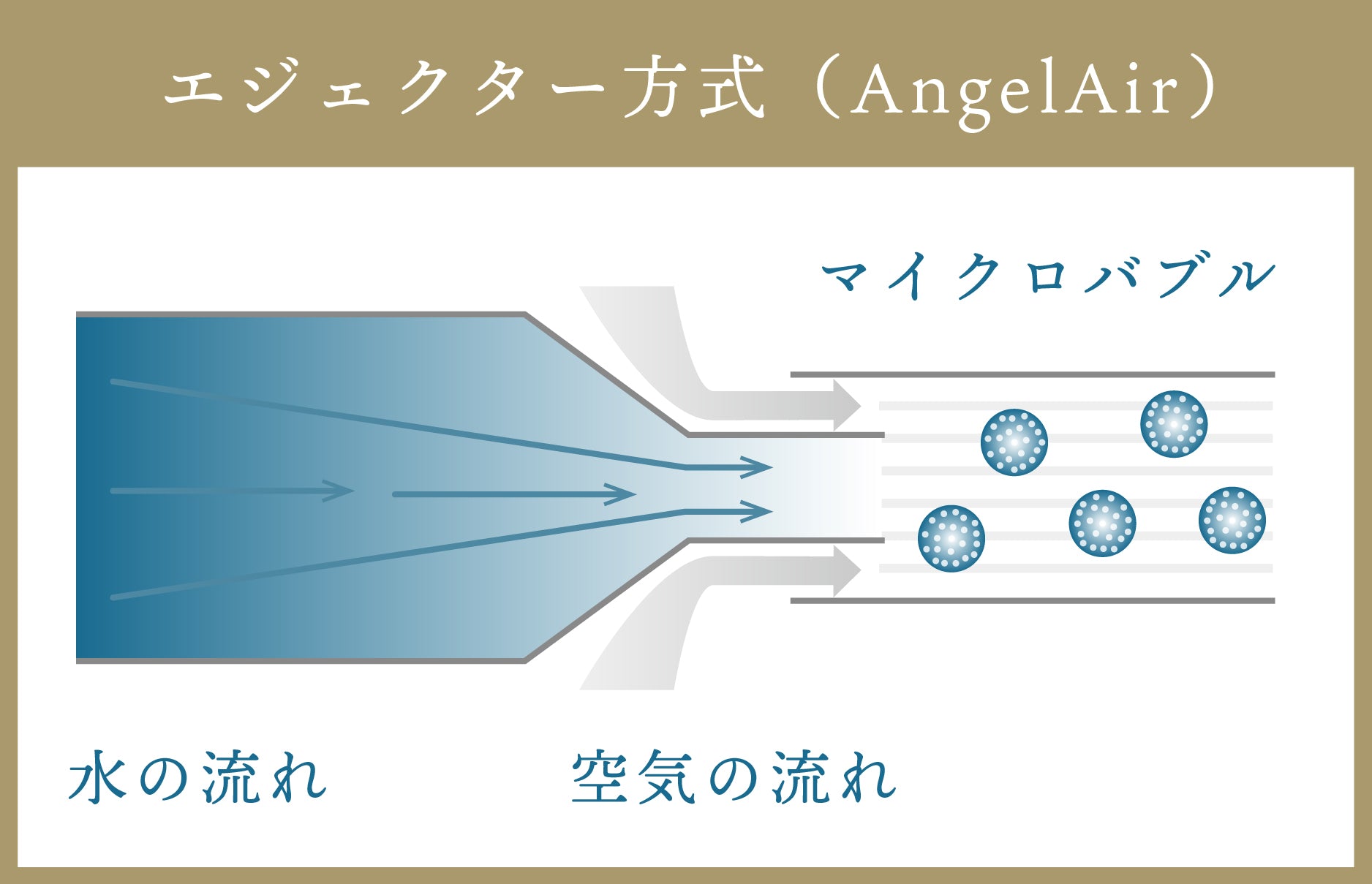 シャワーに含まれるバブル量は、給湯方式や水中に含まれる空気量など、環境や季節によって変化してしまいます。しかし、AngelAirは、独自技術により外部の空気を水の中に吸い込むことで、どんな環境でも安定して多くのマイクロバブルを発生させることができます。このように使用環境に依存しないマイクロバブル発生方式を「エジェクター方式」と呼びます。