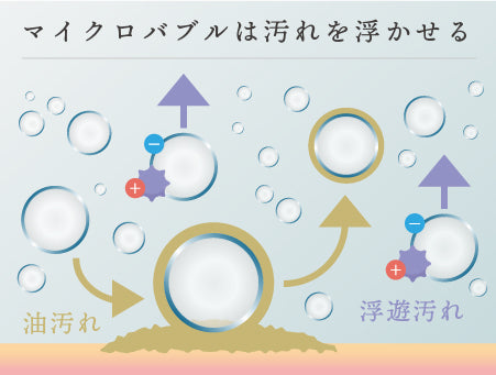 マイクロバブルはマイナスに帯電しているため、プラスの電荷を持つ毛穴の皮脂汚れや肌表面に残ったファンデーションや老廃物を吸着し、汚れと一緒に浮上させる特性があります。