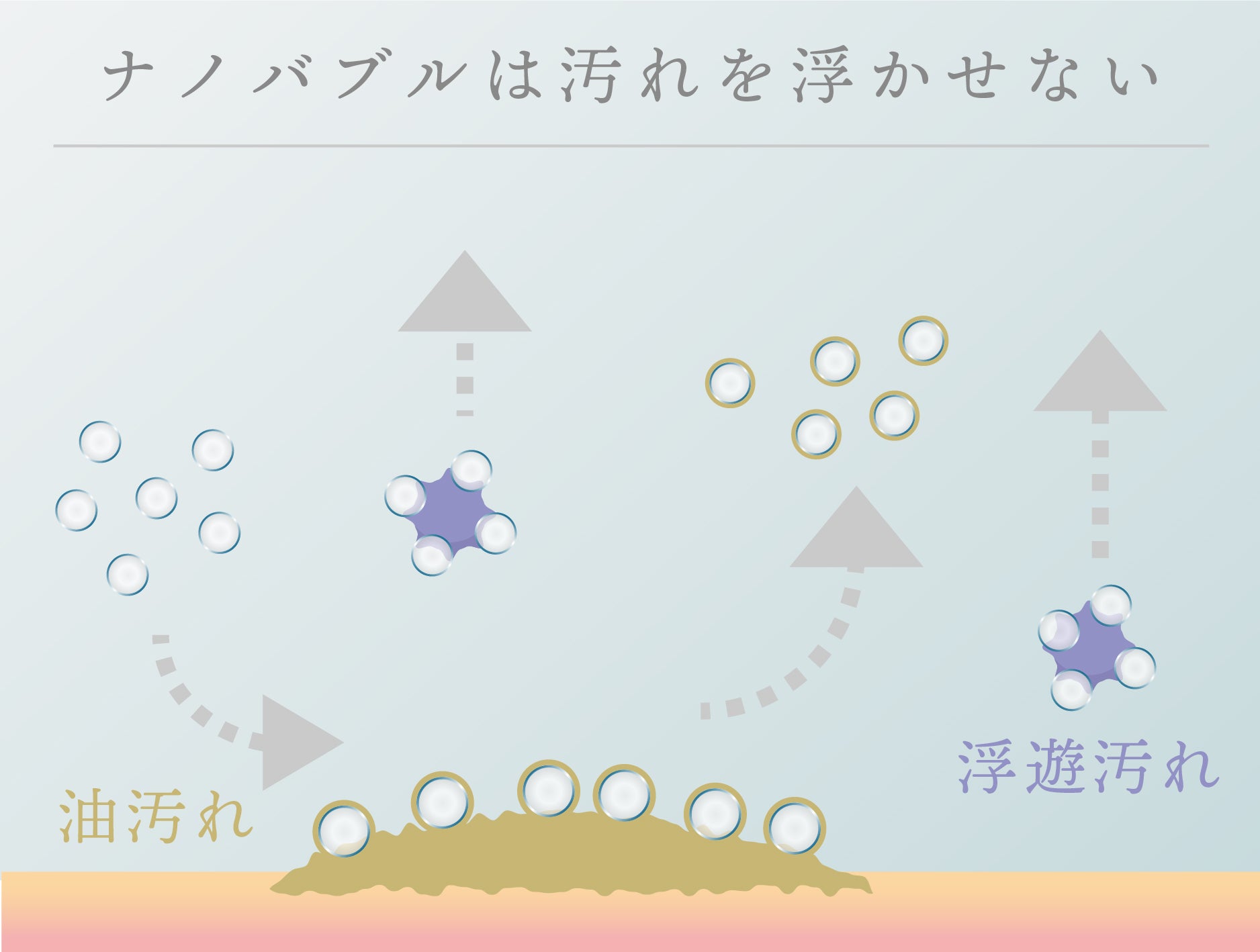 汚れに対するバブルの浮遊力は、バブルの体積の大きさが関係します。ナノバブル よりも大粒のマイクロバブルは体積が大きく多くの汚れを浮上させることができます。