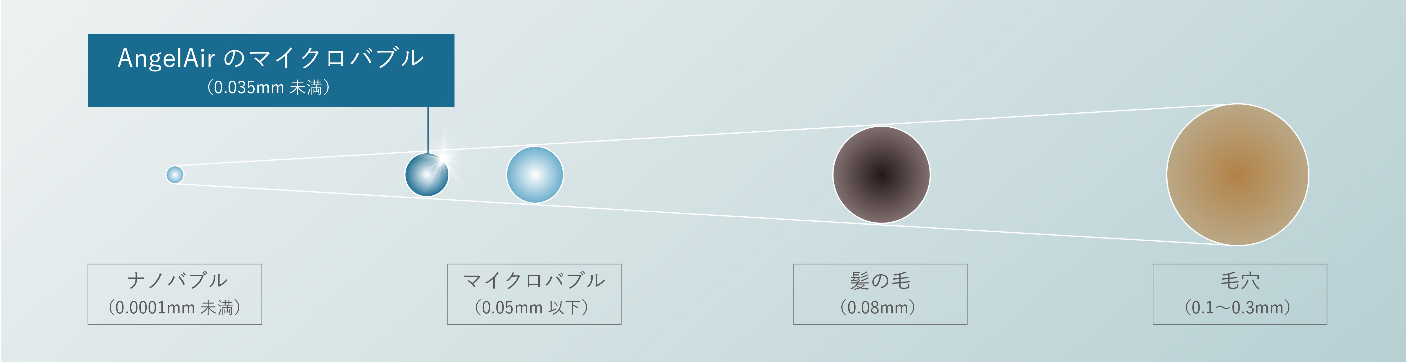 一般的なマイクロバブルは、毛穴の半分程度の小さな気泡です。よく比較されるものにナノバブルといったさらに微細な気泡がミストのように散水するシャワーもありますが、AngelAirの技術者はシャワー本来の基本機能である「洗浄力」を追求した結果、直径0.035mmのマイクロバブルという答えにたどり着きました。AngelAirが提供する「浴び心地の良さ」の根底にはこのマイクロバブルの存在が欠かせません。