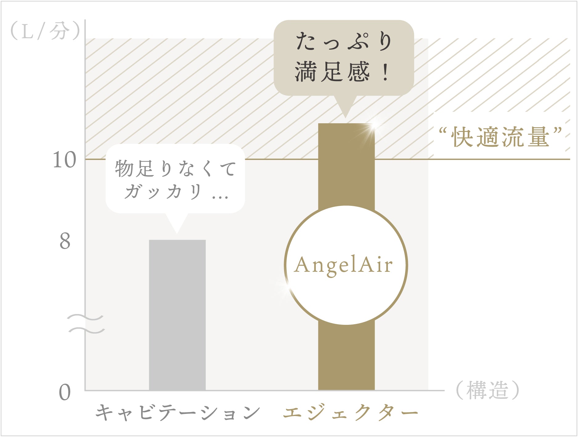 しかし、湯量をたくさん出せるエジェクター方式のAngelAirは、一般的にシャワーを浴びた時に快感に感じる湯量(快適流量)を失わないよう設計されているため、満足感のある浴び心地が感じられます。